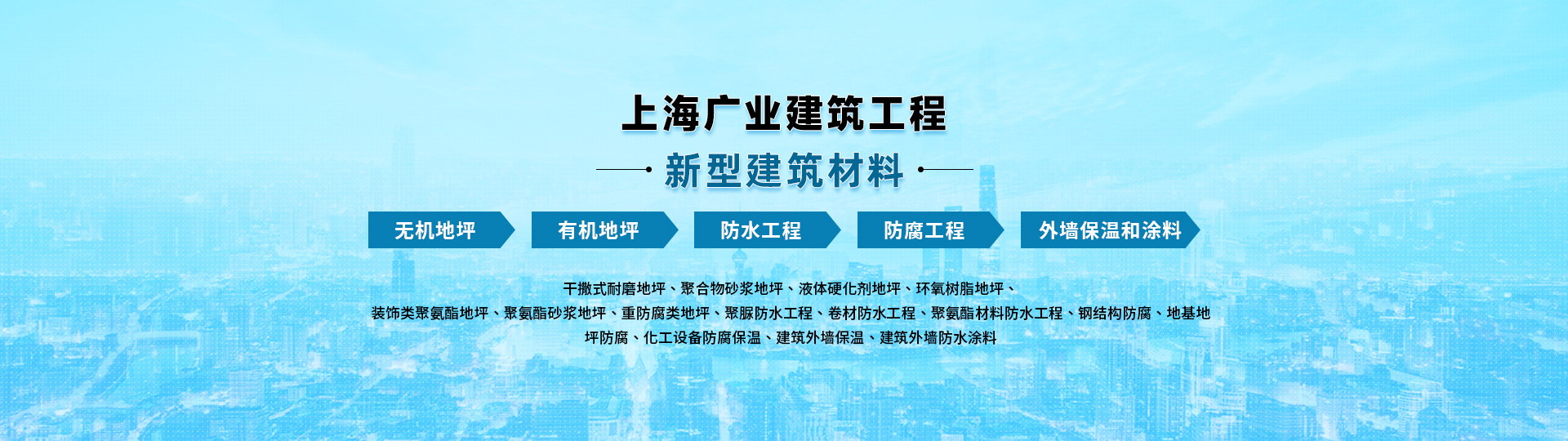 上海广业建筑工程有限公司成立于2010年,是一家为顾客提供地坪、外墙保温和涂料、屋面防水、工业防腐,施工及材料供应一体化服务的专业公司。随着现代工业企业发展,旧材料迭代更新,新型建筑材料层出不穷,本公司在此机遇中诞生、茁壮成长,现已初具规模。